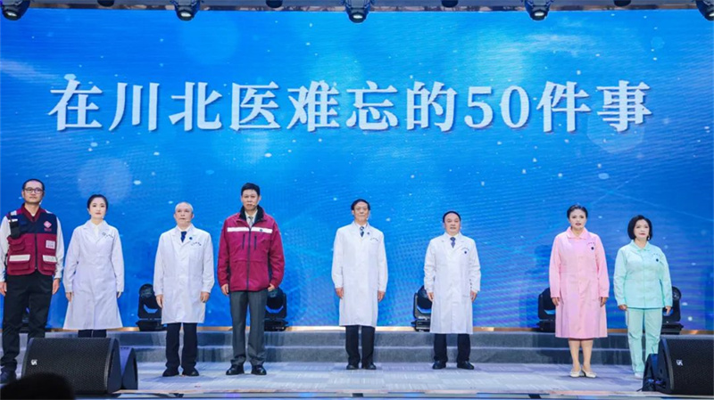 在群话节目《我在川北医学院附属医院的50件事》、诗朗诵《川北医生日快乐》、院歌演唱《大医之道》中,参会嘉宾共同回顾和见证了医院五十年的发展历程、追赶超越的奋斗足迹,抒发了对推动医卫事业高质量发展、守护人民生命健康的美好心愿。