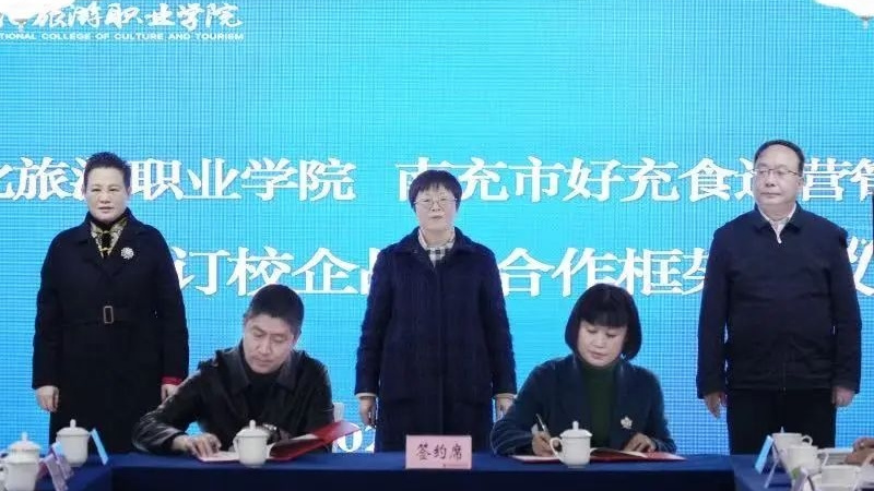 南充文旅职院副院长王爱华代表学校与南充市旅游协会签订校行合作框架协议,与南充市好充食运营管理有限公司签订网络直播合作框架协议,赵秀清、王荣秀、杨建平共同见证签约及授牌仪式。